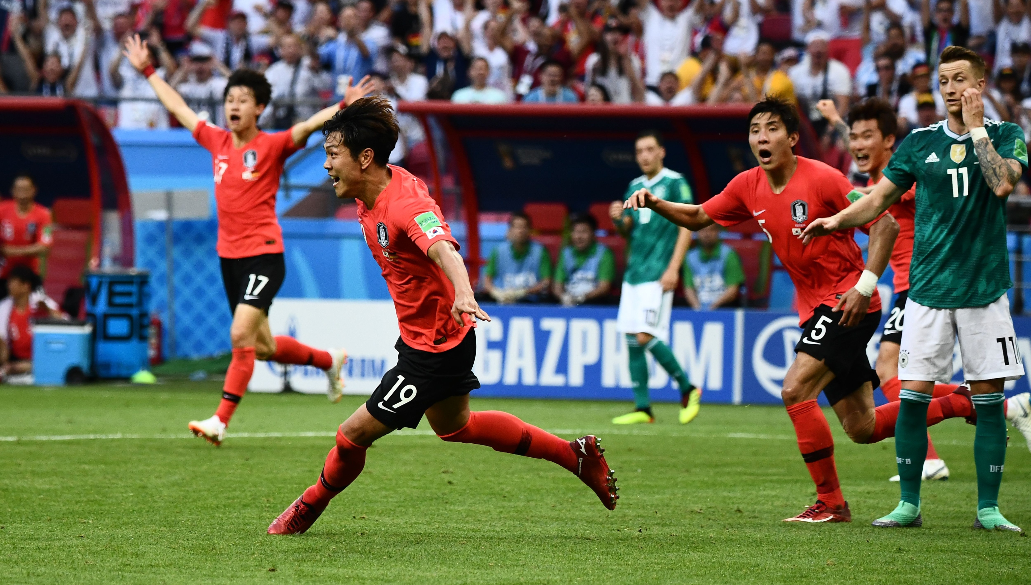 The Germans looked poor and disjointed all day long, as they have for much of the tournament. Needing a win to escape elimination, they were locked 0-0 in extra time with South Korea. One goal could still change everything. And boy, did it. In the 93rd minute, Kim Young-gwon suddenly found the ball at his feet after a corner into the box, just keeper Manuel Neuer to beat. He took the shot. South Korea 1, Germany 0. The Germans are going home at the group stage for the first time since 1938. A second goal, this time from Son Heung-min in the impossibly late 96th minute, added insult to injury. For the third straight World Cup, following 2010 Italy and 2014 Spain, the defending champions fail to reach the knockout rounds. Auf Wiedersehen!